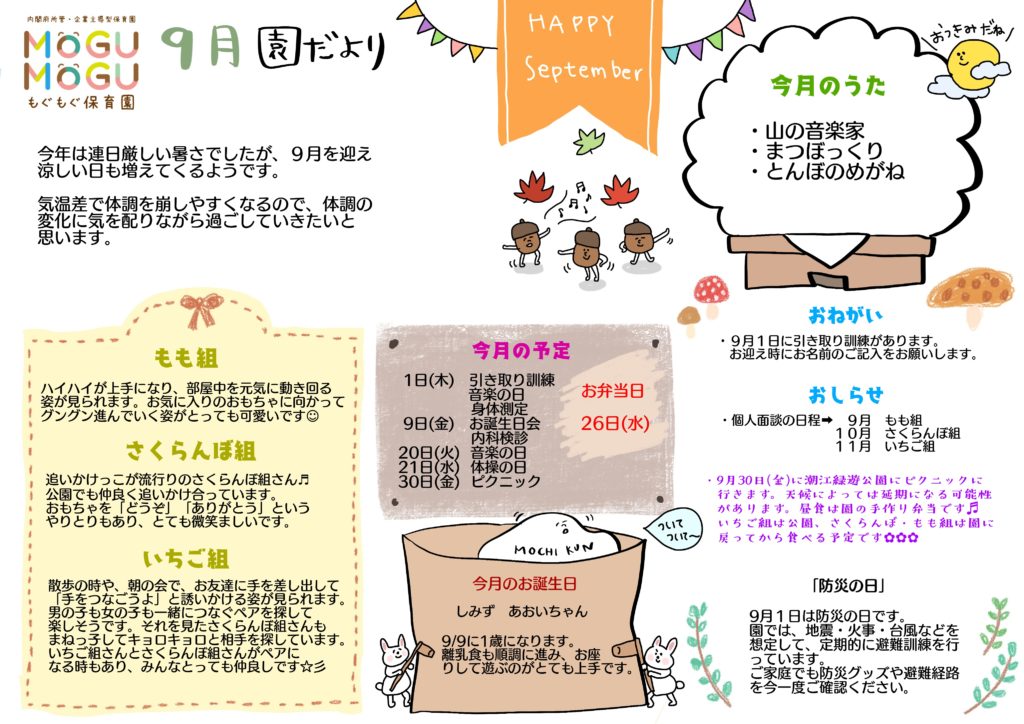 9月 園だより 2022 9/22 スタッフブログ 2022年9月22日 9月の園だよりをアップします☆ スタッフブログ よかったらシェアしてね! URLをコピーしました! お誕生日会 秋を見つけよう♪ 関連記事 避難訓練【1・17は忘れない】 2026年1月22日 英語の日 2026年1月22日 音楽の日🎹 2026年1月22日 お散歩で神社⛩️ 2026年1月22日 感染症 2026年1月8日 節分豆知識👹 2026年1月8日 羽子板と風船🎈 2026年1月8日 足の裏に🦶ペタペタ 2026年1月8日