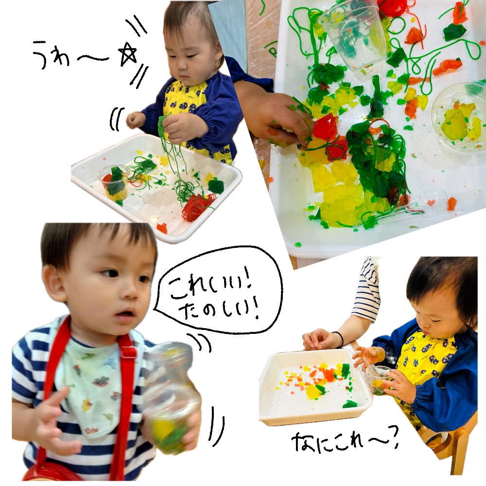 色付きの寒天と春雨が出てくると大喜び☆な子と、恐る恐る触る子と。様子が様々で可愛かったです!