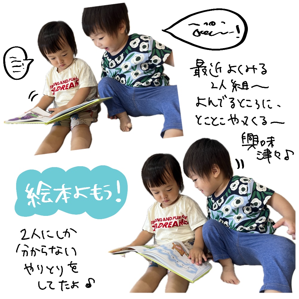 一人の子が読んでいると、興味津々でよってくるお友達。