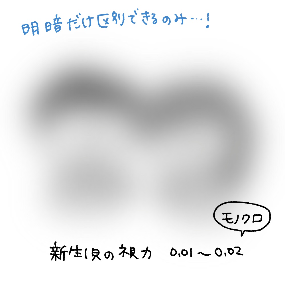 新生児はまぶしいな、暗いな…くらいの認識からスタート。キョロキョロ見ていることが多いかと〜