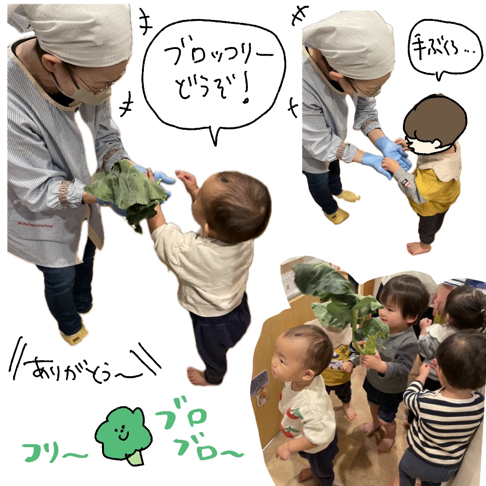葉っぱをちぎってもらい結構な重量の葉っぱをフリフリ楽しそうでした。給食で美味しく食べようねと伝えて調理の先生にお願いしに行きましたよ。給食でブロッコリーもりもり食べていました✨