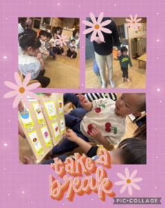 お砂場で遊びました。先生が砂場で大きなお山を作り出すとバケツを持ってきてお山からお砂をすくってバケツに入れる遊びをしていました♪
