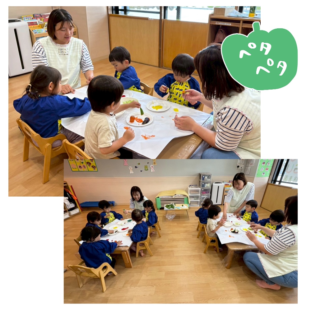 お野菜に絵の具をつけてペタペタ、ペタペタ…