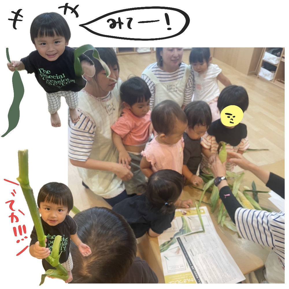 枝についたとうもろこし🌽初めて枝付きを見た皆は、なんだろう…と不思議そうな様子。