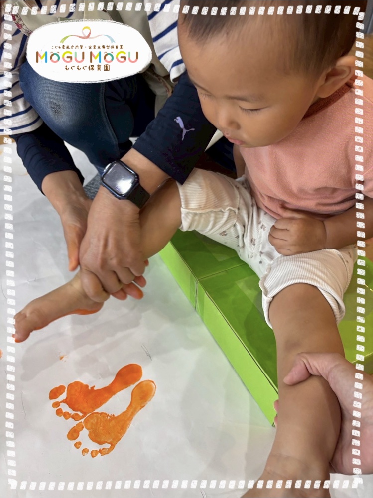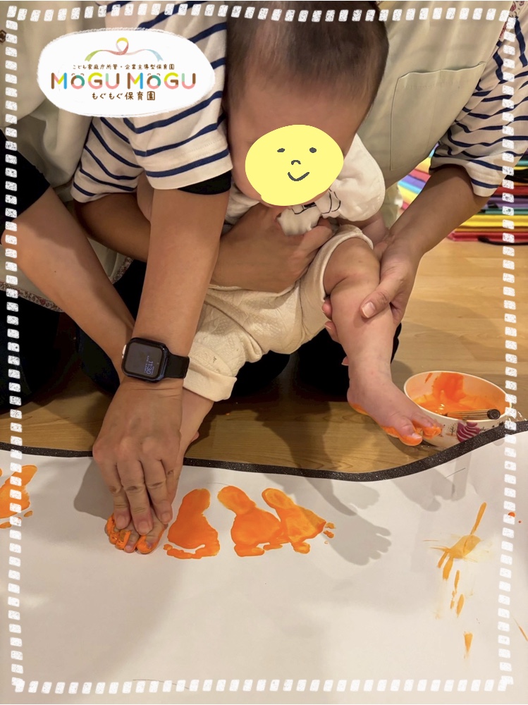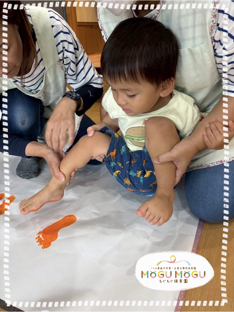 足の裏に絵の具を塗られると、くすぐったいのか笑い声が😆