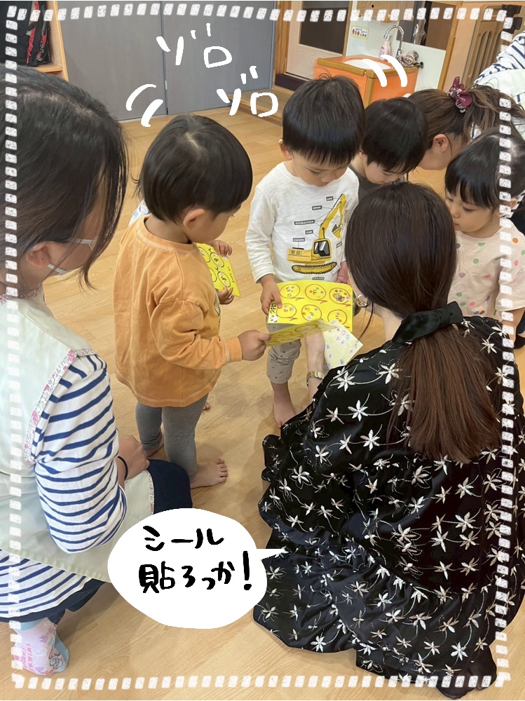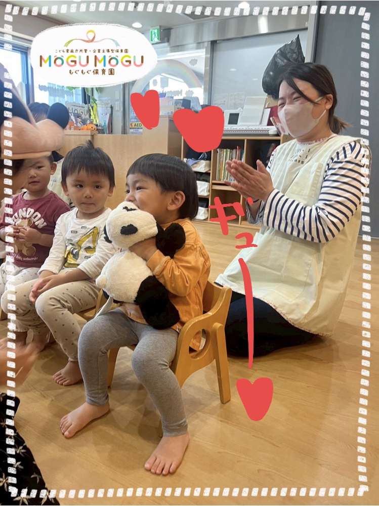 おさるさんとの朝のご挨拶は少し恥ずかしいけどハグは好き!って子もいたら、ノリノリでご挨拶〜な子も♪