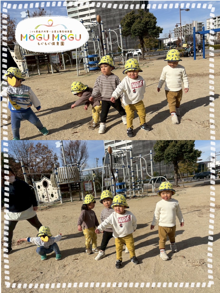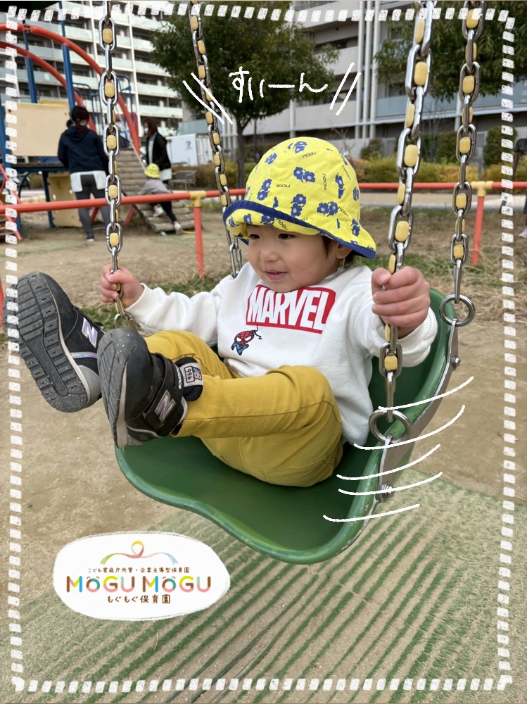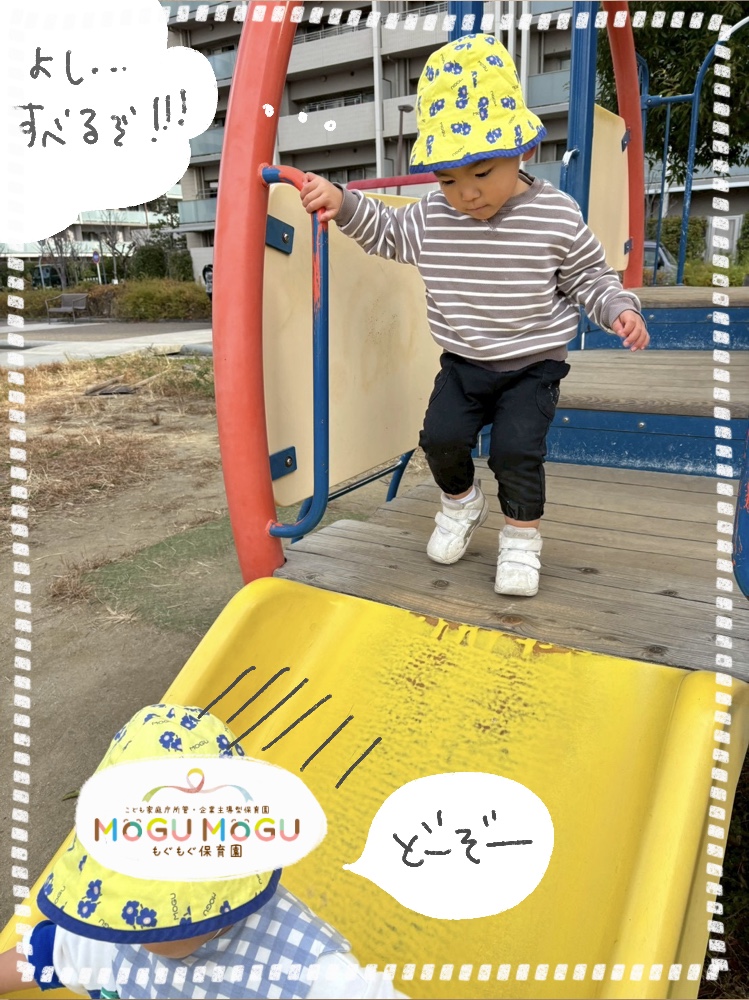 遊具で遊んだあとは、かけっこ!だいぶ走るのにも慣れてきたので、腕を振って走る練習もしました。