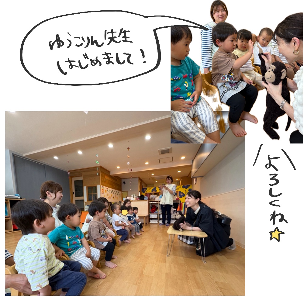 ゆうこりん先生が来てくださいました♪ 先生がミッキーのぬいぐるみを持ってきていたのですが、着ていた服と同じだと気づくお友達★ 「一緒一緒」と嬉しそう〜 先生を見な... -