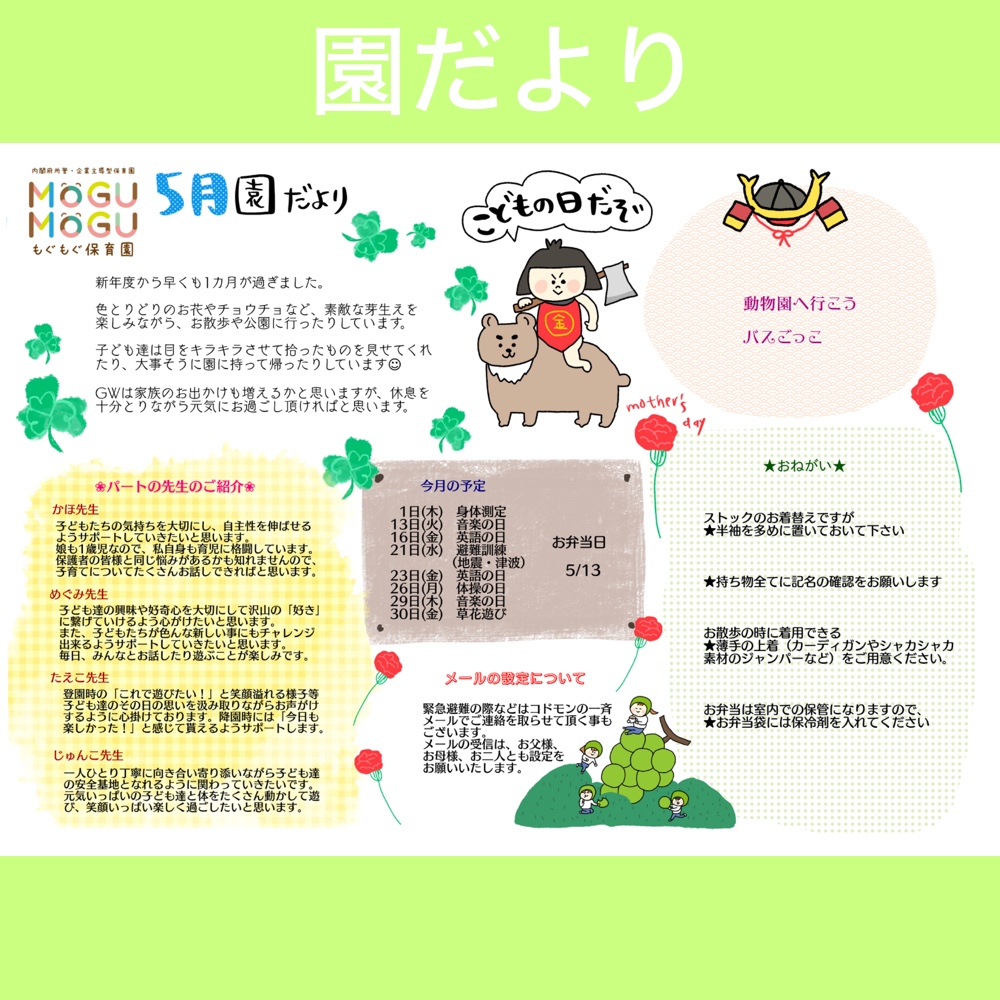 5月5日は子供の日でしたね🎏 おでかけしたり、ゆっくりご家族で過ごされたり…いろんなGWだったのではないでしょうか✨ お天気もとてもよく、元気よく登園後も公園で遊ん... -