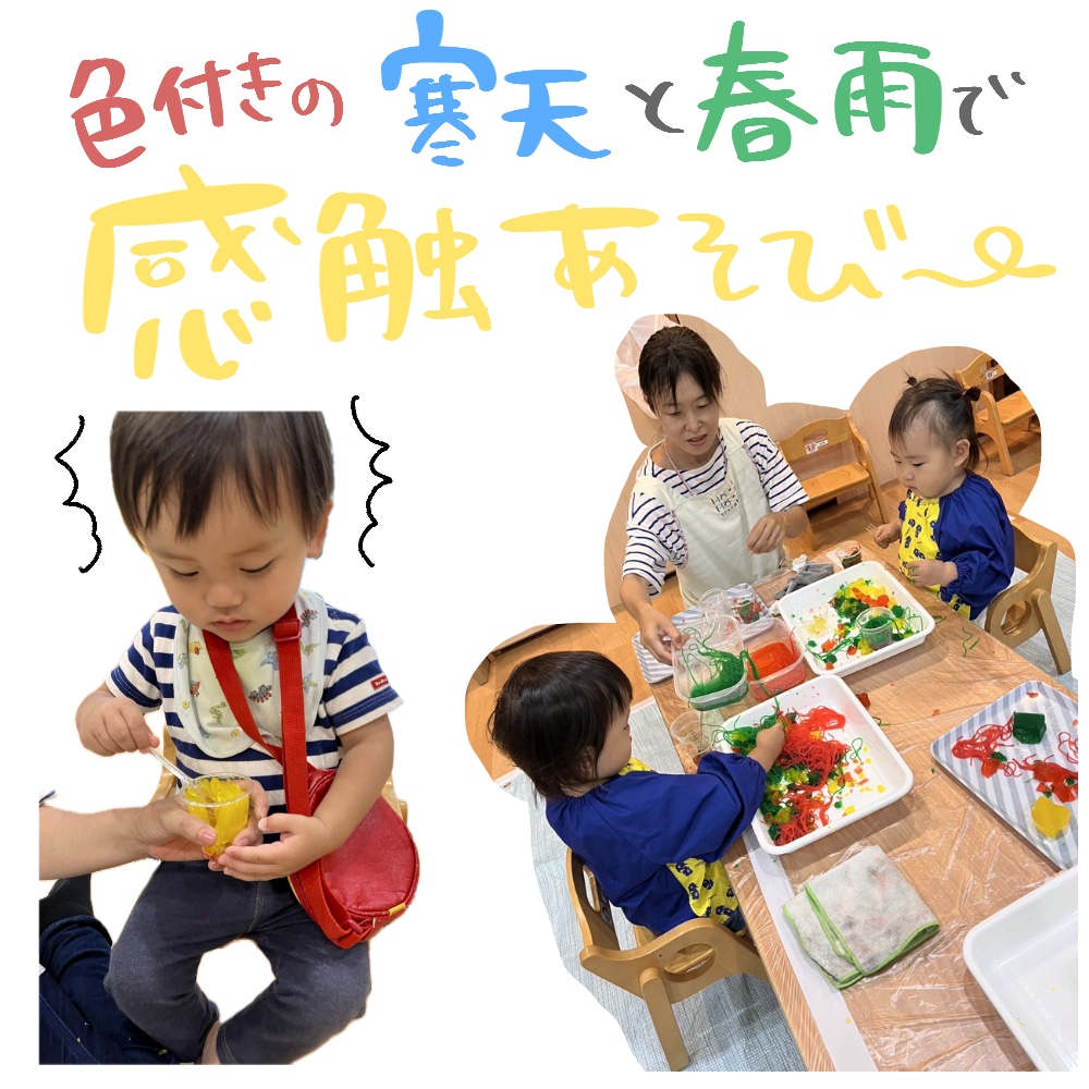 今日は…感触遊びの日♪ 色付きの寒天と春雨が出てくると大喜び☆な子と、恐る恐る触る子と。様子が様々で可愛かったです! すぐに保育者の真似をして触ってみたり潰してみ... -