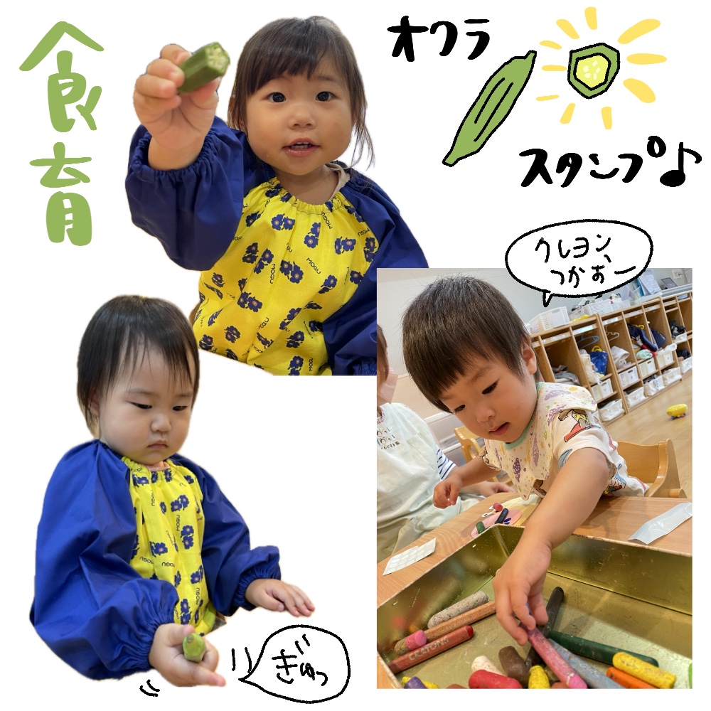 先日は食育で… オクラを使ってスタンプにしてみました☆ 可愛い形ですよね、オクラって。 ぎゅっと握ってみたり、香りをかいでみたり… 自由に触れていましたよ☆ 普段遊ぶ... -