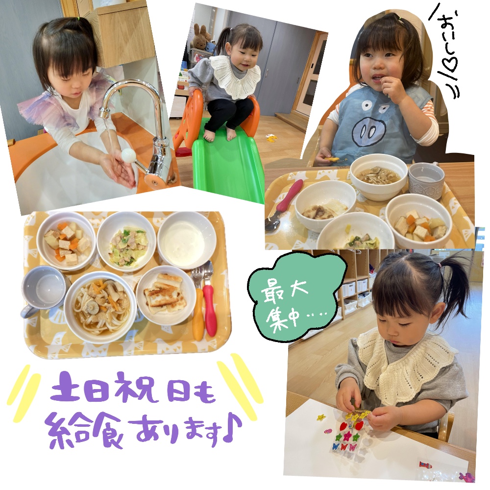 土日祝日も開園しています☆ 人数が平日に比べて少ないので、ゆったりと穏やかな時間が流れています。 普段、できないこともできたり…☆ ご飯も給食まので、しっかり栄養... -