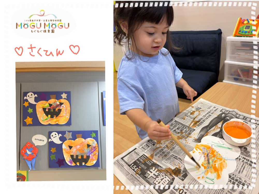 秋の制作をしました🎃 先日クレヨンで模様を描いたかぼちゃに、続きで…絵の具を使って色を塗ってはじき絵をしました✨ 筆を使って夢中で色付けを楽しんでいましたよ👍素敵...