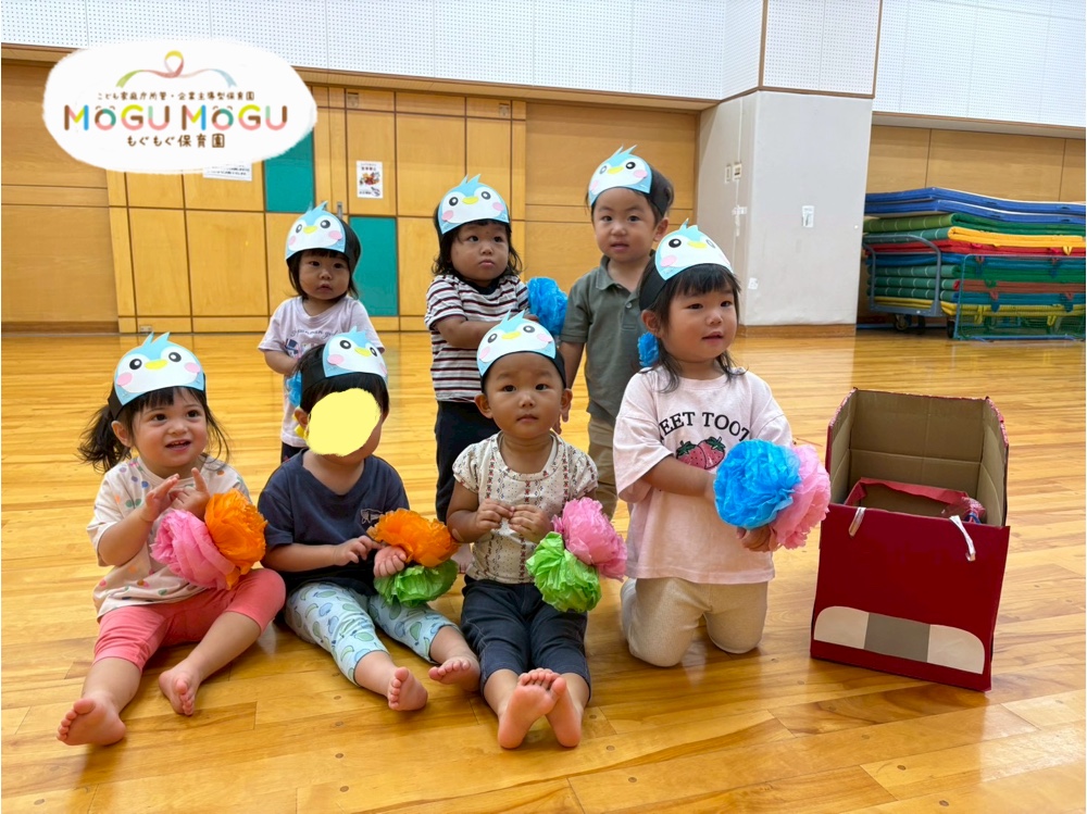運動会ごっこをしました🍀 お面とお花の飾りをつけうれしそうにロケットペンギンをしていましたよ✨ 広いスペースだったのでいつもより多めに走り回ってさらに楽しそう〜... -